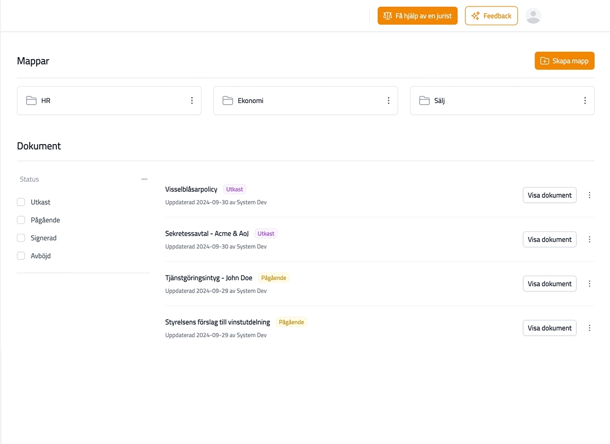 Den intuitiva plattformen är byggd för att möta ditt behov av struktur med olika avtal. Du får full kontroll och trygg förvaring av juridiska dokument. Avtalsportalen gör juridisk administration tillgänglig, enkel och lätthanterlig - så du kan lägga mer tid på din kärnverksamhet.