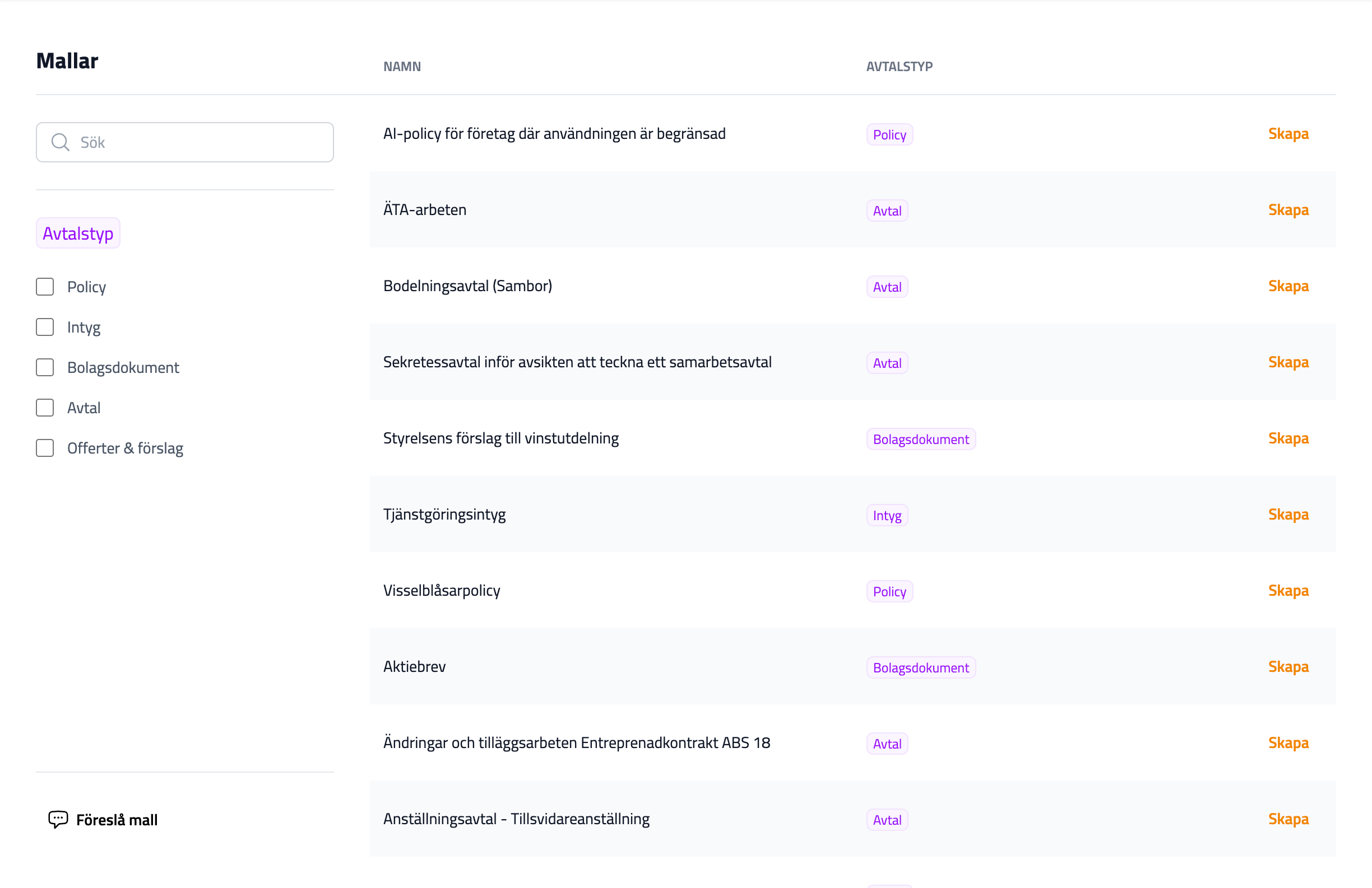 Alla mallar är uppdaterade enligt senaste lagstiftningen, redo att fyllas i och signeras digitalt. Effektivisera din