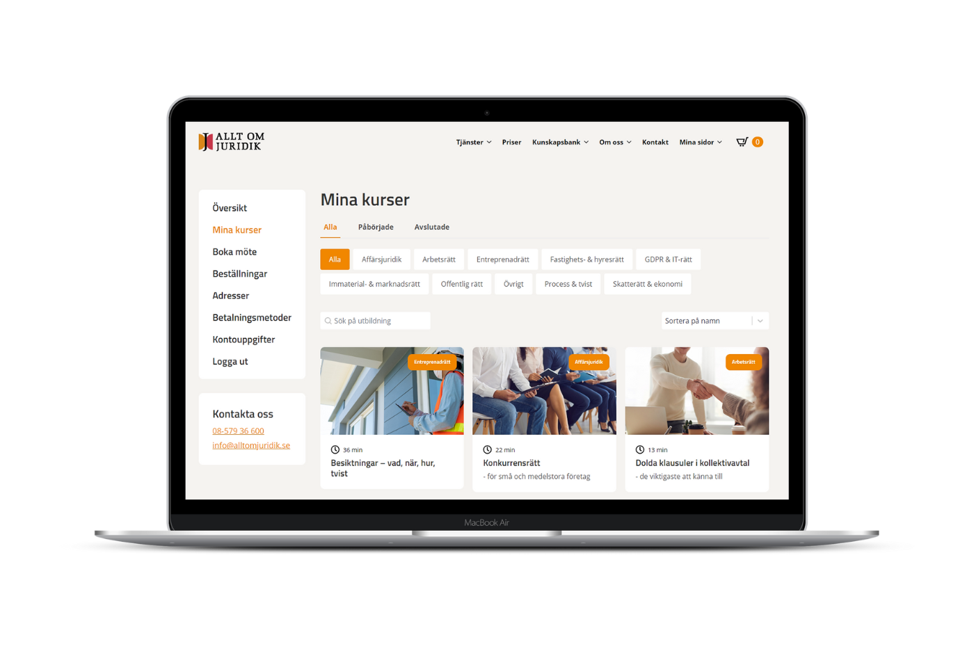 Våra digitala kurser är utformade för att förse företagare med den juridiska kompetens de behöver och stödja deras verksamhet med att hantera juridiska frågor. Med över 30 års erfarenhet inom juridisk utbildning erbjuder vi både enskilda kurser och kurspaket, som du kan köpa och ta del av när det passar dig, var du än befinner dig.